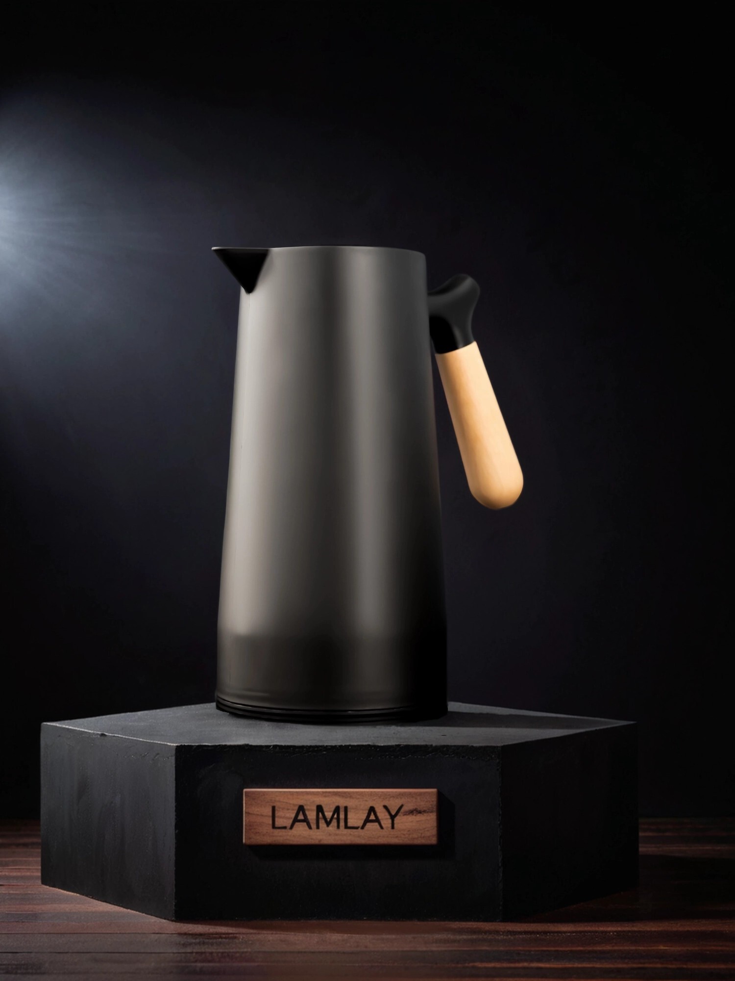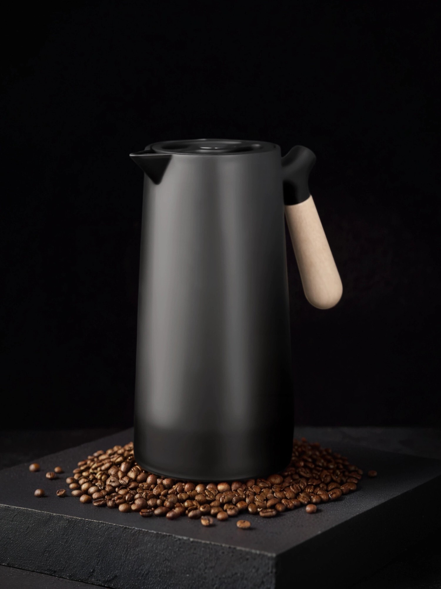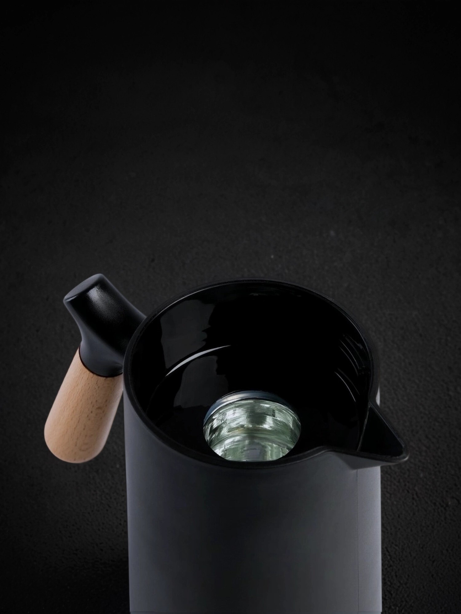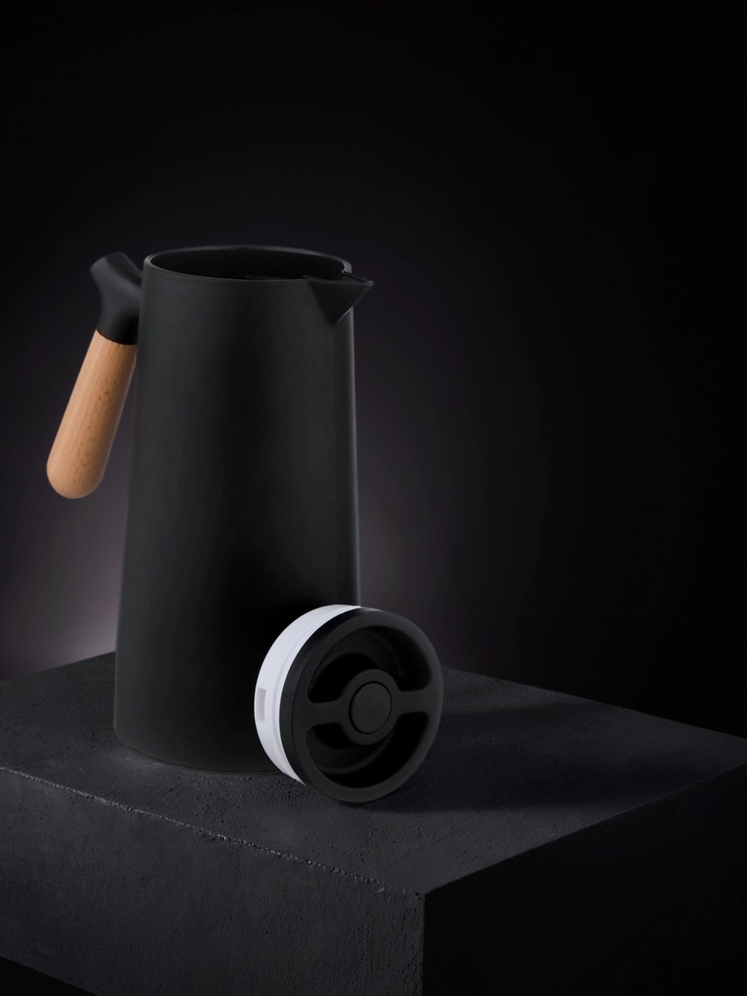 Чайник-термос объемом 1 литр выполнен в стильном черном матовом цвете и имеет деревянную ручку в стиле "лофт".